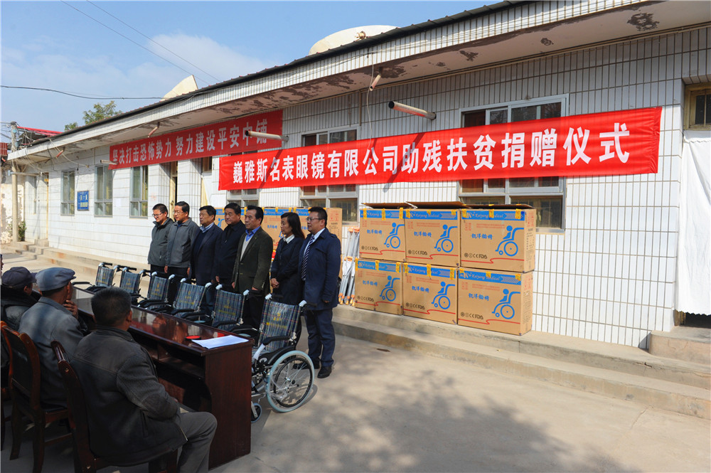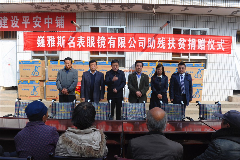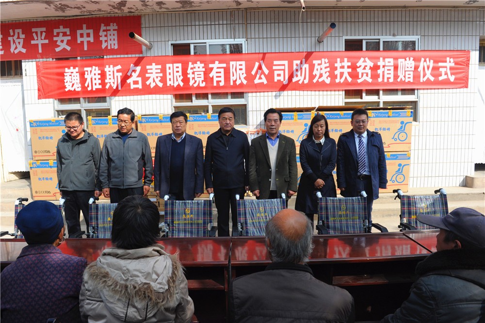 10月24日上午,巍雅斯名表眼鏡有限公司助殘扶貧捐贈儀式在臨洮縣中鋪鎮(zhèn)政府舉行,巍雅斯名表眼鏡有限公司向中鋪鎮(zhèn)殘疾人資助了19100元現(xiàn)金并捐贈了價值11970元的輪椅及拐杖等,希望能夠解決受捐助的殘疾人當前的困難。臨洮縣人大常委會主任蔣景林參加捐贈儀式并講話,高度評價了巍雅斯在社會公益慈善事業(yè)常年來所做的努力。