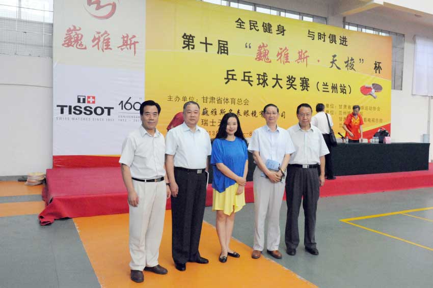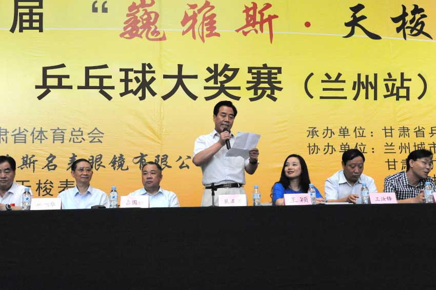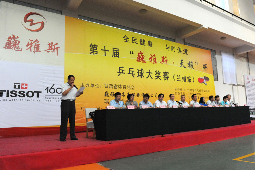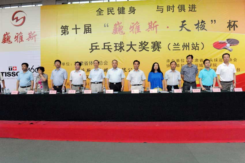 8月15日上午,在蘭州城市學(xué)院培黎校區(qū)體育館,備受社會(huì)各界關(guān)注的體育比賽——第十屆“巍雅斯·天梭”杯乒乓球大獎(jiǎng)賽(蘭州站),在超千名運(yùn)動(dòng)員及體育愛(ài)好者的歡呼聲中正式拉開(kāi)帷幕。此次大獎(jiǎng)賽由甘肅省體育總會(huì)、巍雅斯名表眼鏡有限公司和瑞士天梭表主辦,甘肅省乒乓球協(xié)會(huì)承辦,蘭州城市學(xué)院、甘肅省廣播電影電視總臺(tái)、蘭州晨報(bào)協(xié)辦。應(yīng)邀出席當(dāng)天活動(dòng)的領(lǐng)導(dǎo)及嘉賓有:蘭州軍區(qū)黨委常委、蘭州軍區(qū)聯(lián)勤部部長(zhǎng)、原蘭州軍區(qū)副參謀長(zhǎng)楊旭華、甘肅省廣播電影電視總臺(tái)總臺(tái)長(zhǎng)康堅(jiān)、蘭州城市學(xué)院院長(zhǎng)王汝峰、中國(guó)鐘表商會(huì)副會(huì)長(zhǎng)、甘肅省眼鏡協(xié)會(huì)會(huì)長(zhǎng)、甘肅省乒協(xié)副主席、巍雅斯名表眼鏡有限公司董事長(zhǎng)裴正江、瑞士天梭表中國(guó)區(qū)副總裁王穎、甘肅省司法廳巡視員、甘肅省乒協(xié)副主席張克年、甘肅省乒乓球運(yùn)動(dòng)協(xié)會(huì)主席穆端敏、甘肅省體育局副局長(zhǎng)馬賽敏、甘肅省廣播電影電視總臺(tái)副臺(tái)長(zhǎng)王小樞、蘭州晨報(bào)社總編輯周丹波、甘肅省體育總會(huì)常務(wù)副秘書(shū)長(zhǎng)丁思林等領(lǐng)導(dǎo)。開(kāi)幕式由甘肅省司法廳巡視員、甘肅省乒協(xié)副主席張克年主持。