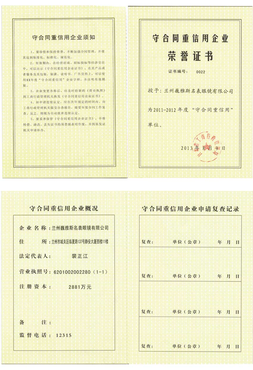 近日,甘肅省工商局授予蘭州巍雅斯名表眼鏡有限公司“2011-2012年度省級(jí)守合同重信用企業(yè)”稱號(hào),這是繼蘭州市工商局授予蘭州公司“2011年度守合同重信用企業(yè)”稱號(hào)之后,蘭州公司又一殊榮。