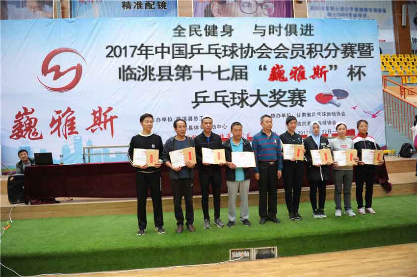 甘肅省乒乓球運動協(xié)會會長韓力,甘肅省乒乓球運動協(xié)會副會長、巍雅斯名表眼鏡有限公司董事長裴正江,甘肅省乒乓球運動協(xié)會秘書長宋建農(nóng),臨洮縣總工會常務副主席張國林、臨洮縣體育運動中心主任劉儉、臨洮縣總工會副主席劉艷,巍雅斯名表眼鏡有限公司總裁裴明偉,巍雅斯名表眼鏡有限公司副總裁裴明宏,廣河縣誠德民族用品有限公司總經(jīng)理馬應虎等領導出席閉幕式并為獲獎運動員頒獎。