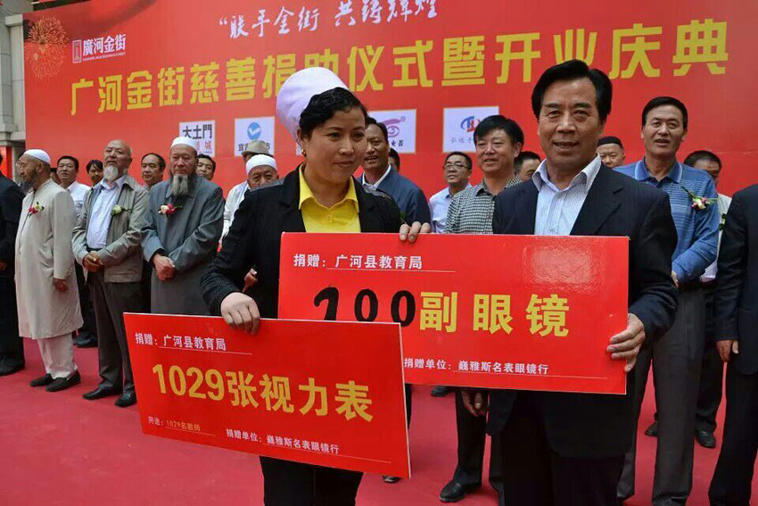 5月30日,廣河金街慈善捐助儀式暨開業(yè)慶典活動在金街商場中心盛大舉行,來自廣河縣各行各業(yè)的嘉賓及社會各界人士歡聚于此,共同見證了廣河金街的開業(yè)盛況。巍雅斯名表眼鏡有限公司作為廣河金街的重要合作伙伴,董事長裴正江先生作為貴賓受邀參加當日的開業(yè)慶典,并在慈善捐助儀式上代表巍雅名表眼鏡有限公司向廣河縣優(yōu)秀教師和貧困學生捐贈眼鏡200付,視力表1030張,總價值11萬元。