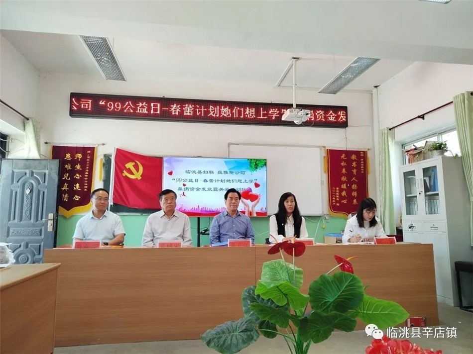 “小康大業(yè),人才為本,人才強(qiáng)國、教育興邦?!?月24日下午,在臨洮縣辛店中學(xué)舉行了臨洮縣婦聯(lián)、 巍雅斯“99公益日-春蕾計(jì)劃她們想上學(xué)”募捐資金發(fā)放暨關(guān)愛活動(dòng)儀式。臨洮縣婦聯(lián)主席孫碧蘭 、巍雅斯名表眼鏡有限公司董事長裴正江、巍雅斯名表眼鏡有限公司副總經(jīng)理裴明宏、辛店鎮(zhèn)人民政府副鎮(zhèn)長鄧小英、辛店中學(xué)校長孫新華出席了儀式。